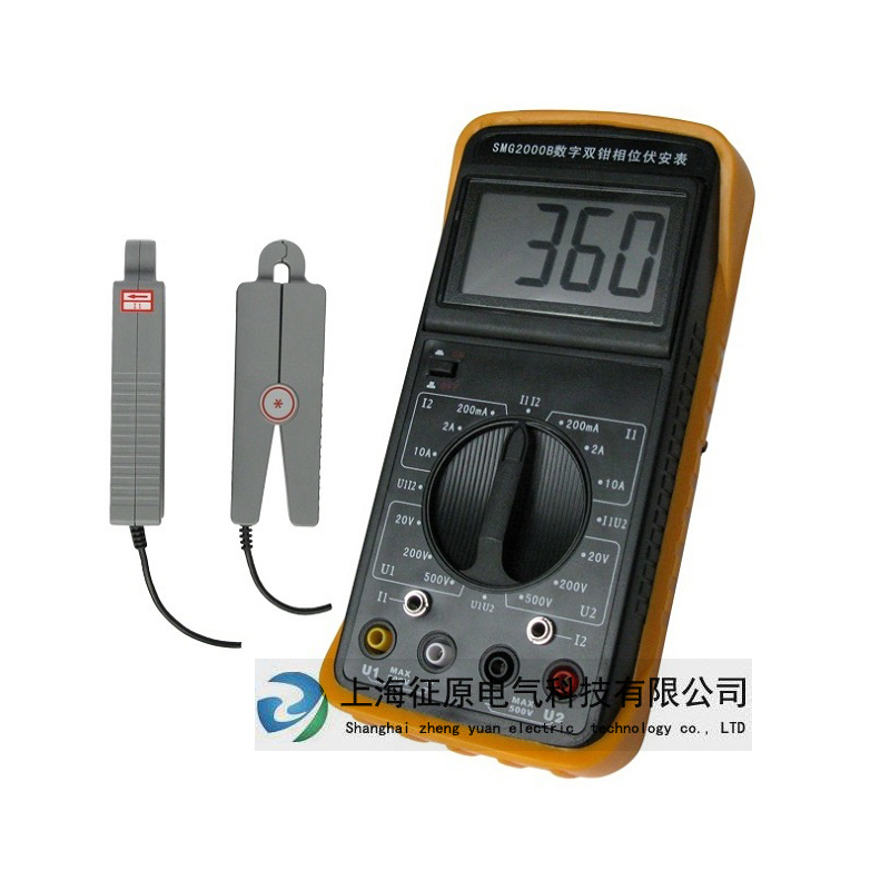 數(shù)字雙鉗相位伏安表SMG2000B是專為現(xiàn)場(chǎng)測(cè)量電壓、電流及相位而設(shè)計(jì)的一種高精度、低價(jià)位、手持式、雙通道輸入測(cè)量儀表。用該表可以很方便地在現(xiàn)場(chǎng)測(cè)量U-U、I-I及U-I之間的相位,判別感性、容性電路及三相電壓的相序,檢測(cè)變壓器的接線組別,測(cè)試二次回路和母差保護(hù)系統(tǒng),讀出差動(dòng)保護(hù)各組CT之間的相位關(guān)系,檢查電度表的接線正確與否等。采用鉗形電流互感器轉(zhuǎn)換方式輸入被測(cè)電流,因而測(cè)量時(shí)無需斷開被測(cè)線路。測(cè)量U1-U2之間相位時(shí),兩輸入回路完全絕緣隔離,因此完全避免了可能出現(xiàn)的誤接線造成的被測(cè)線路短路、以致燒毀測(cè)量儀表。顯示器采用了高反差液晶顯示屏,字高達(dá)25mm,屏幕角度可自由轉(zhuǎn)換約70°,以獲最佳視覺效果。外殼采用工程絕緣材料,另配橡皮防振保護(hù)套,安全、可靠。