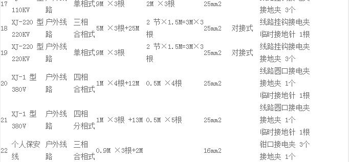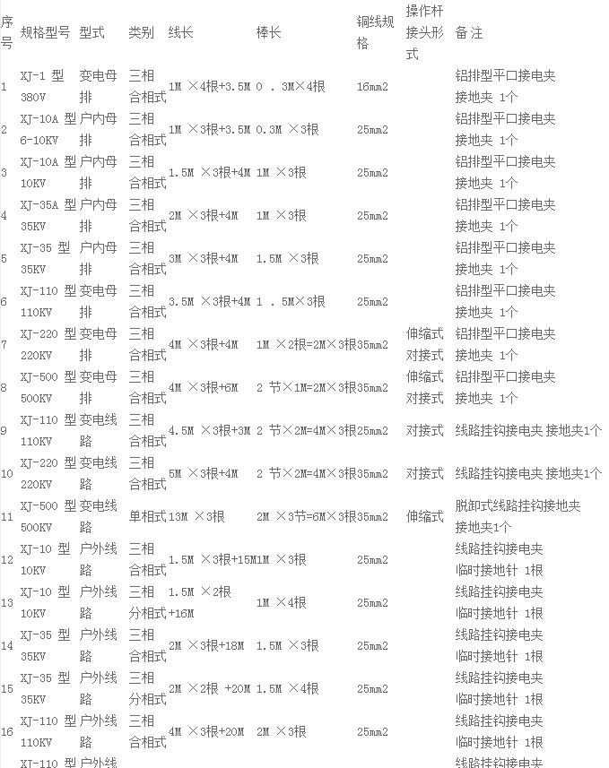 短路接地線配置表型號、規(guī)格: